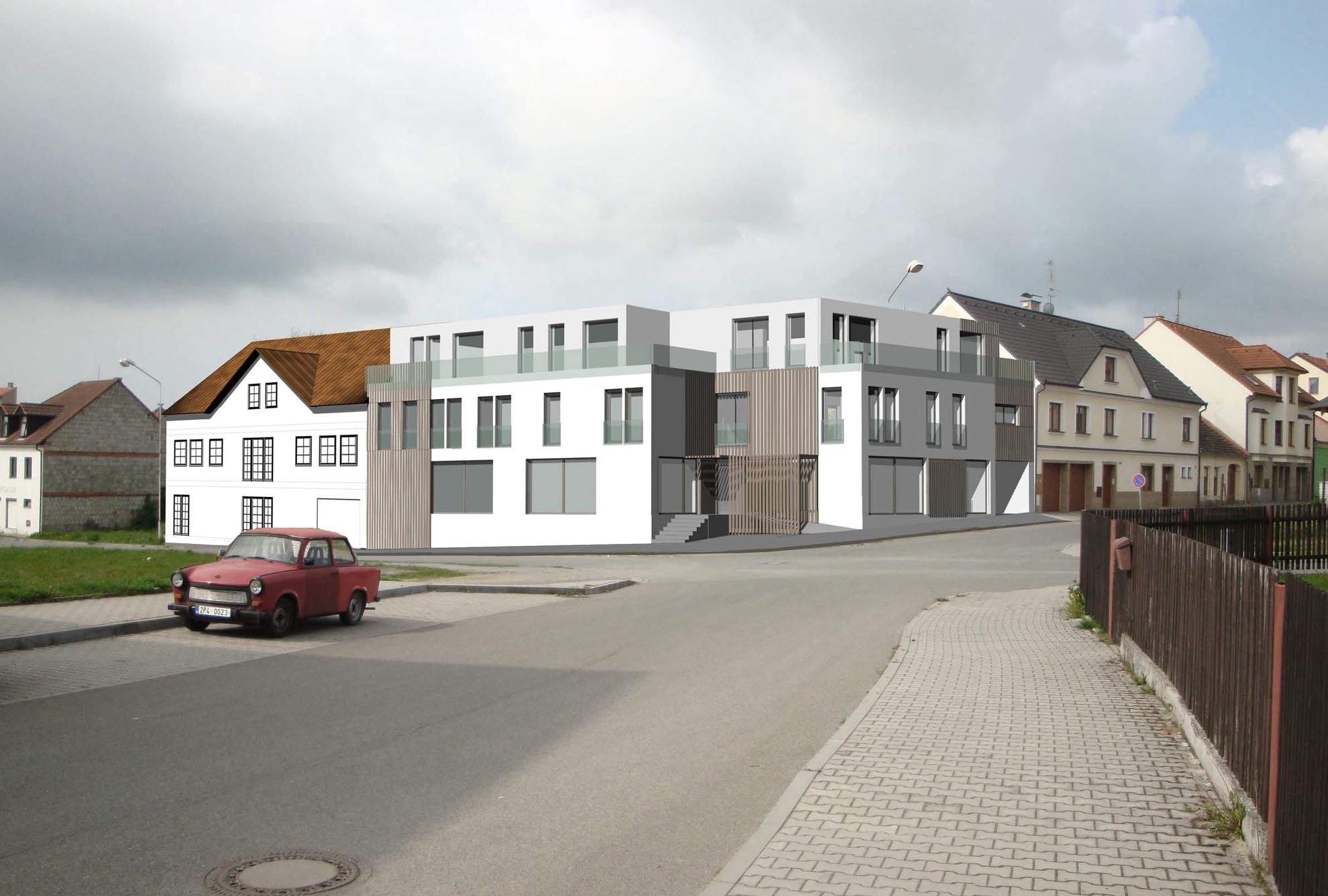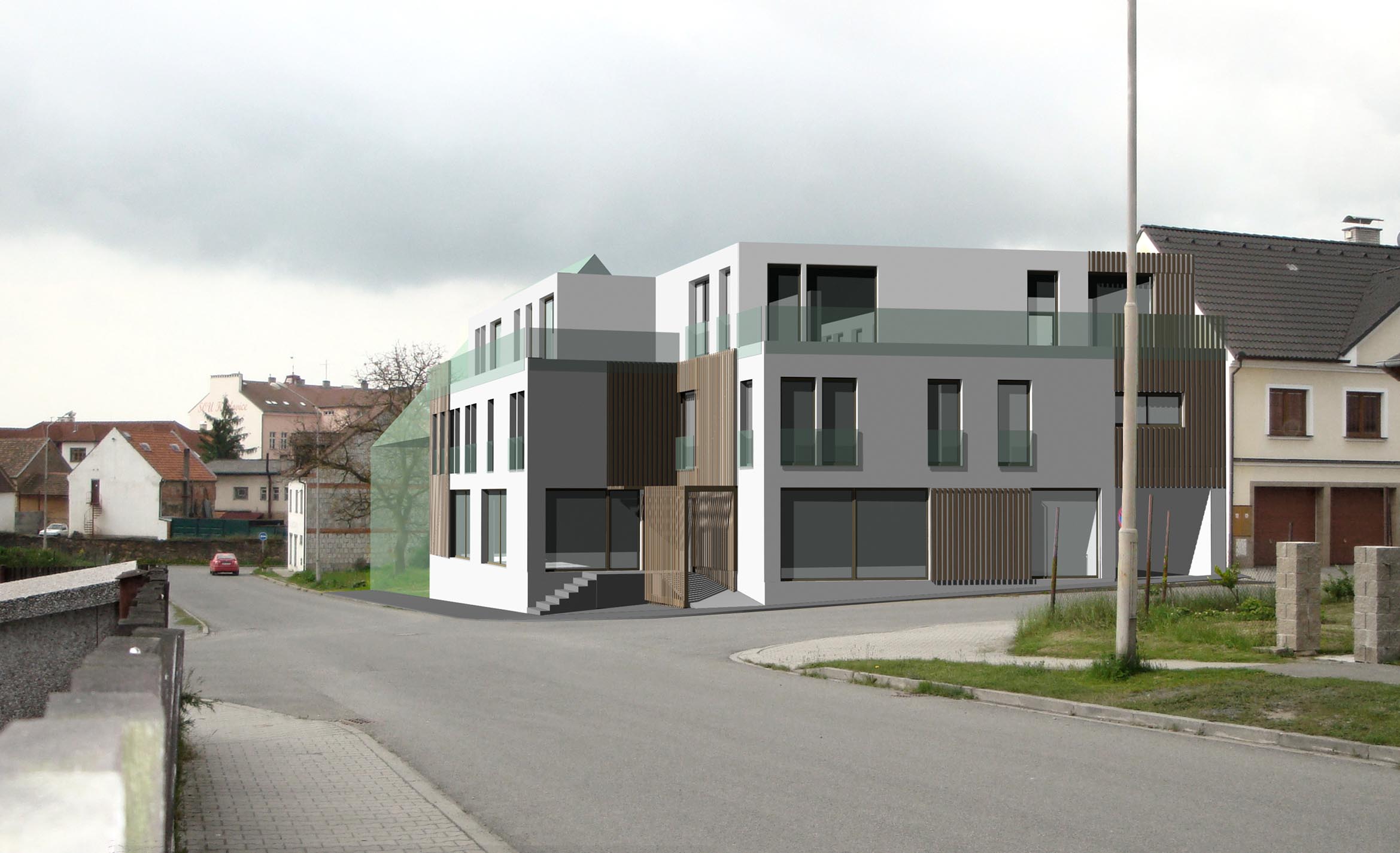 KRALOVICE - novostavba nárožního 4 podlažního bytového domu s obchody v přízemí a fitnes v suterenu.